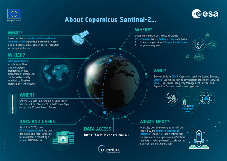 <figure><img src="https://2993576723-files.gitbook.io/~/files/v0/b/gitbook-x-prod.appspot.com/o/spaces%2FaeFFaXxEeZmdbsofIXux%2Fuploads%2FWdRayXCEtNPdYP5Uebc1%2FSentinel-2-infographic-1.png?alt=media&#x26;token=de853737-a220-43a5-a7a8-1065ef619705" alt=""><figcaption><p><a href="https://sentinel.esa.int/web/sentinel/missions/sentinel-2">https://sentinel.esa.int/web/sentinel/missions/sentinel-2</a></p></figcaption></figure>